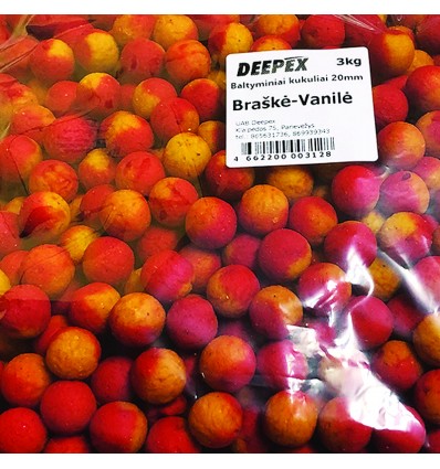 Pašariniai boiliai karpiams – Braškė vanilė, 20mm, 3 kg pakuotė. Klasikinis saldus jaukinimo profilis – braškės skonis su švelnia vanilės nata. Ekonomiški 3 kg boiliai didelei karpio žūklavietei išjaukinti.